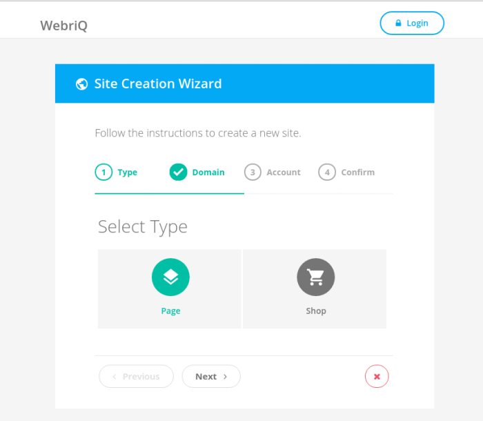Upon clicking the button, you will be redirected to a site creation wizard where you will be asked to select the type of website you want to create i.e. page or shop. When you choose page option, you will be asked to choose a template. For a free account, there are 4 different templates to choose from i.e. WebriQ Business, WebriQ Portfolio, WebriQ Landing Page, WebriQ Starter Page. Click on the desired option and hit Next.