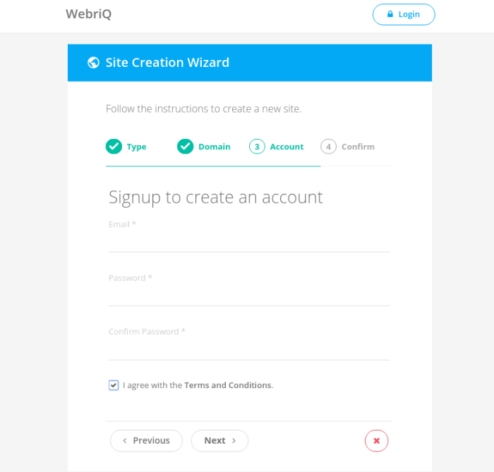 Once you have selected the type, you will need to enter the site name for your website. The website lets you create a subdomain under the webriqs.com primary domain. On the next page, enter your details such as email address, and password to complete the process. Check “I agree to the terms and conditions” and hit next.